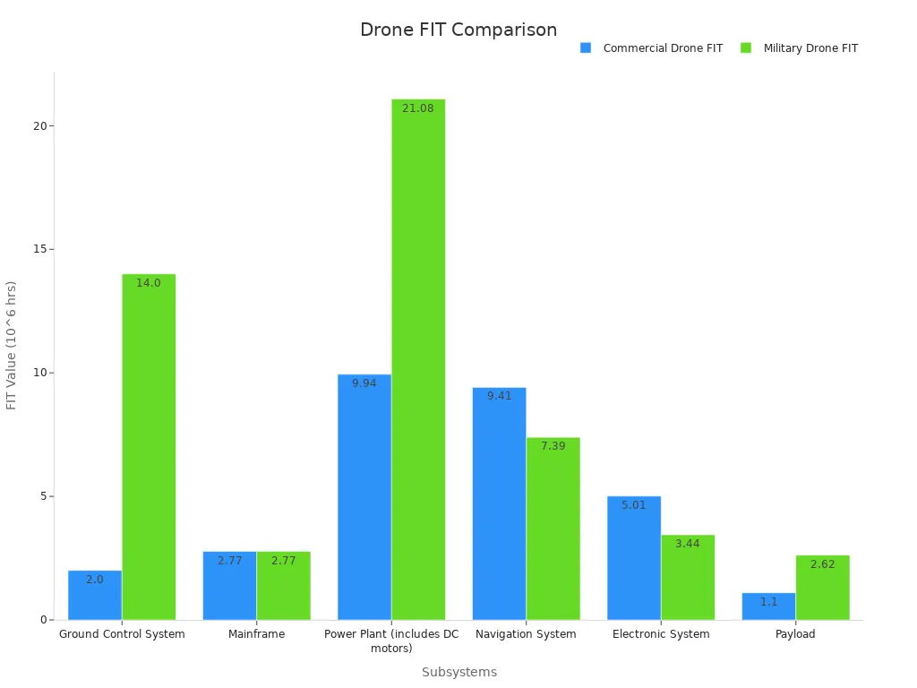 Tip: Always select reliable components. The power plant, which includes the motors, has the highest failure rate among drone subsystems. Reliability data shows that the power plant accounts for 32.88% of failures in commercial drones. Use the table below to compare subsystem reliability and plan your maintenance schedule.