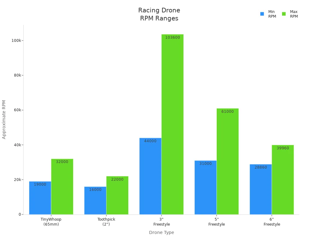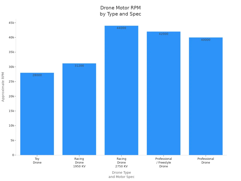 Racing drones demand the highest RPMs, often reaching 30,000 to 50,000 RPM or more. For example, a 5-inch FPV racing drone with a 2500 KV motor and a 6S battery can achieve up to 55,500 RPM. This high speed delivers rapid acceleration and sharp turns, which are essential for competitive racing. The table below highlights how different racing drone classes compare: