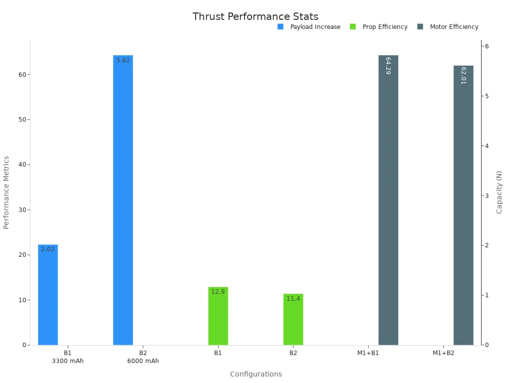 You can expect a 1000kv motor to deliver between 500 and 800 grams of thrust, depending on your setup. The right combination of motor, propeller, and battery makes a significant difference in performance. The table below highlights how different configurations impact efficiency and payload capacity: